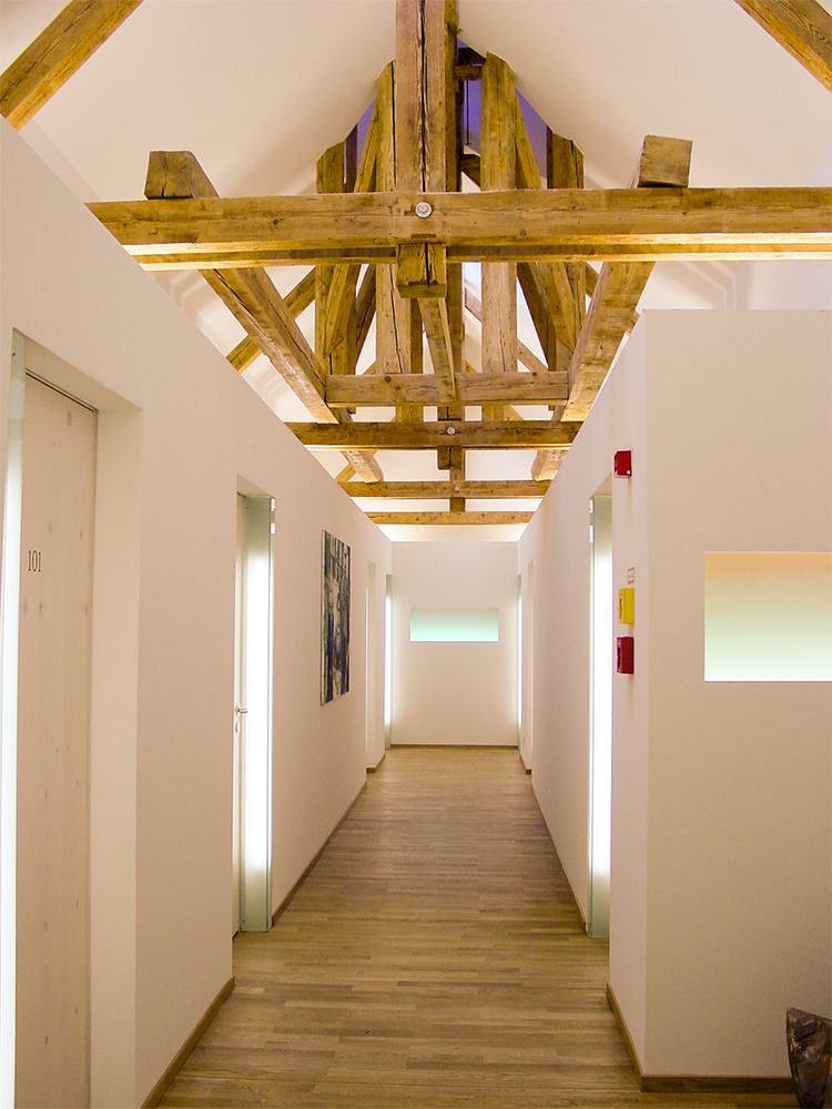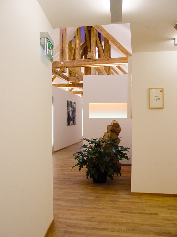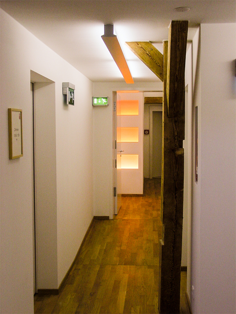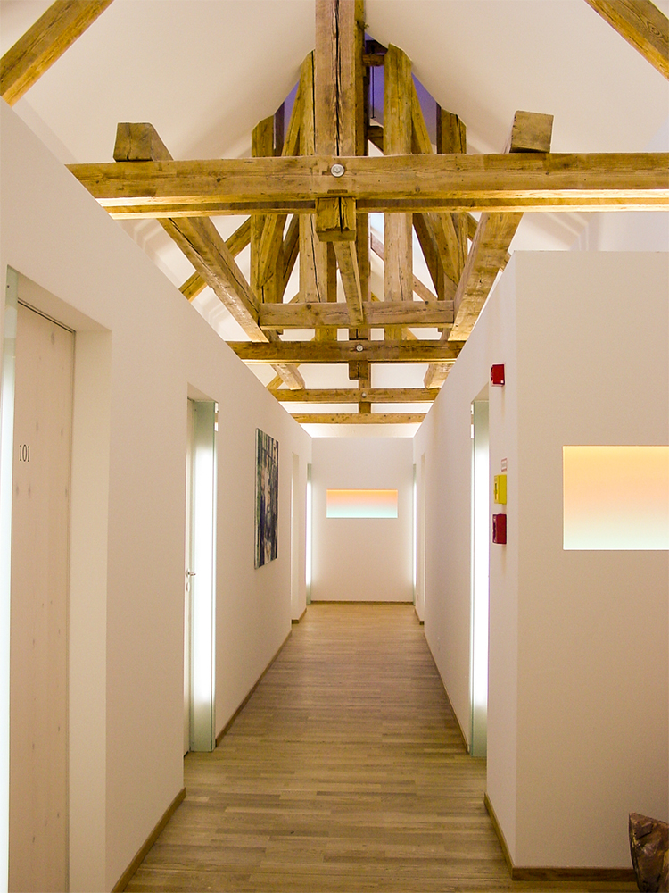 Im Rahmen eines Renovierungsprojektes wurde der Dachstuhl in Hotelzimmer umgebaut. Außerhalb der Zimmer sollte die Struktur des Dachstuhls mit dem alten Glockenturm noch erlebbar bleiben. Die Herausforderung war in einem geschlossennen Gang, ohne Sichtverbindung nach aussen, ein Gefühl von Luftigkeit und Offenheit zu vermitteln.
