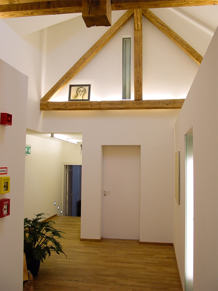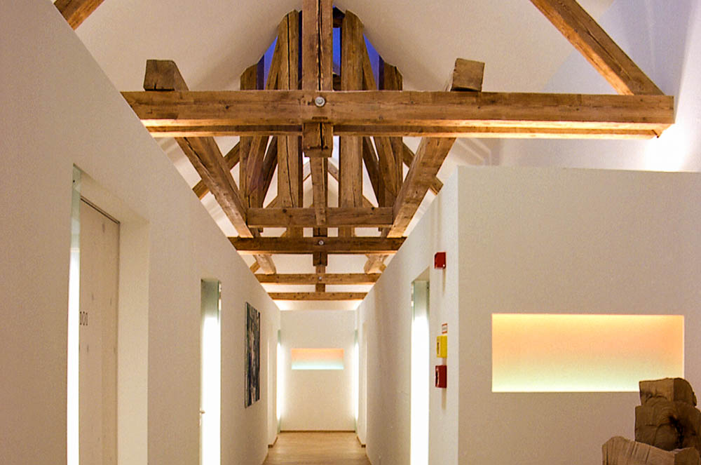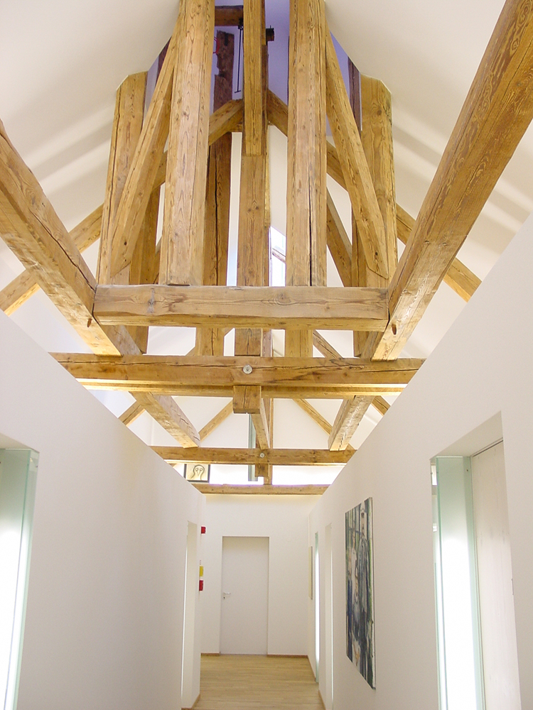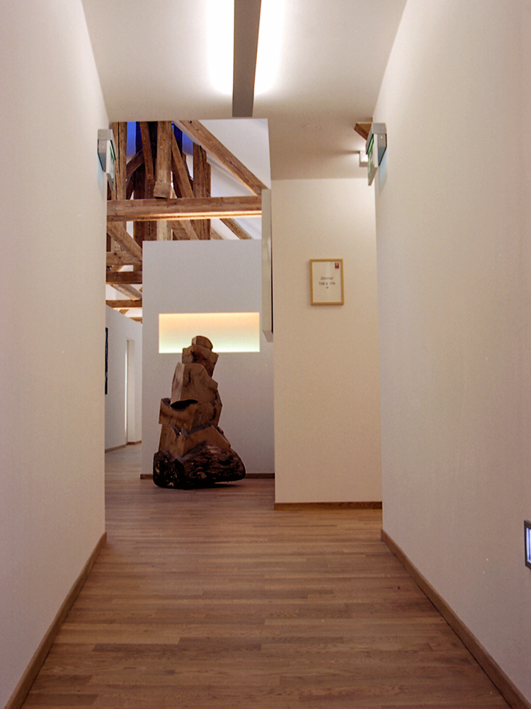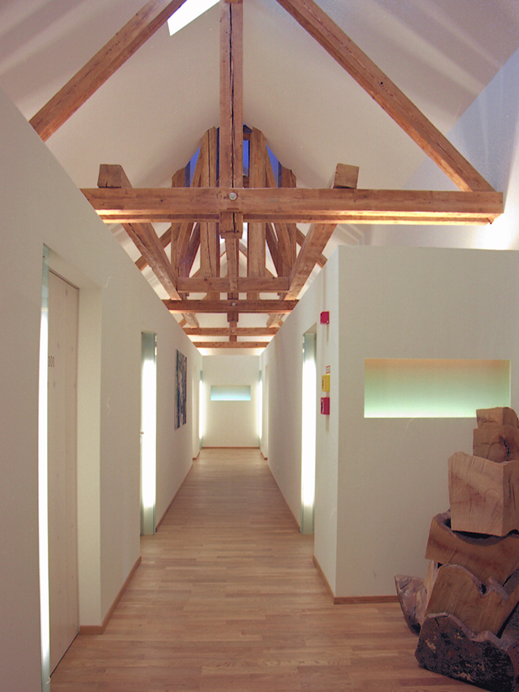 Im Rahmen eines Renovierungsprojektes wurde der Dachstuhl in Hotelzimmer umgebaut. Außerhalb der Zimmer sollte die Struktur des Dachstuhls mit dem alten Glockenturm noch erlebbar bleiben. Die Herausforderung war in einem geschlossennen Gang, ohne Sichtverbindung nach aussen, ein Gefühl von Luftigkeit und Offenheit zu vermitteln.