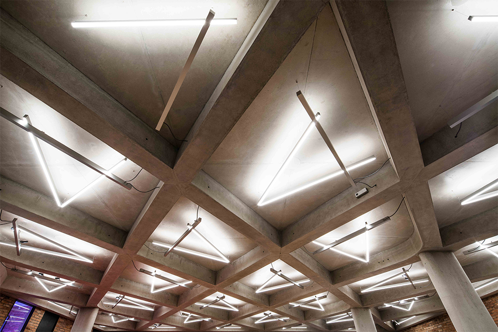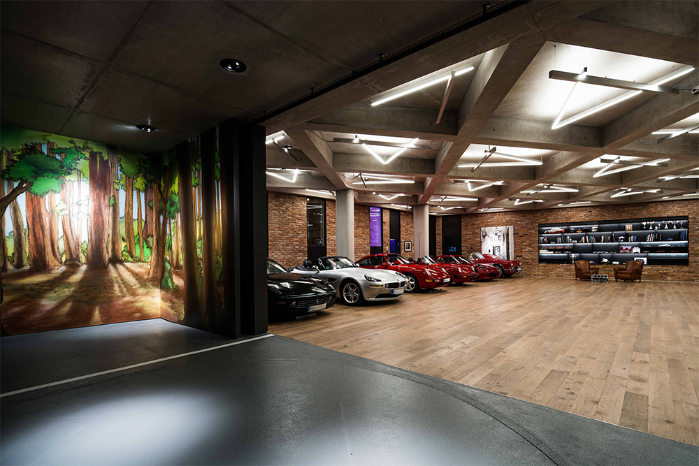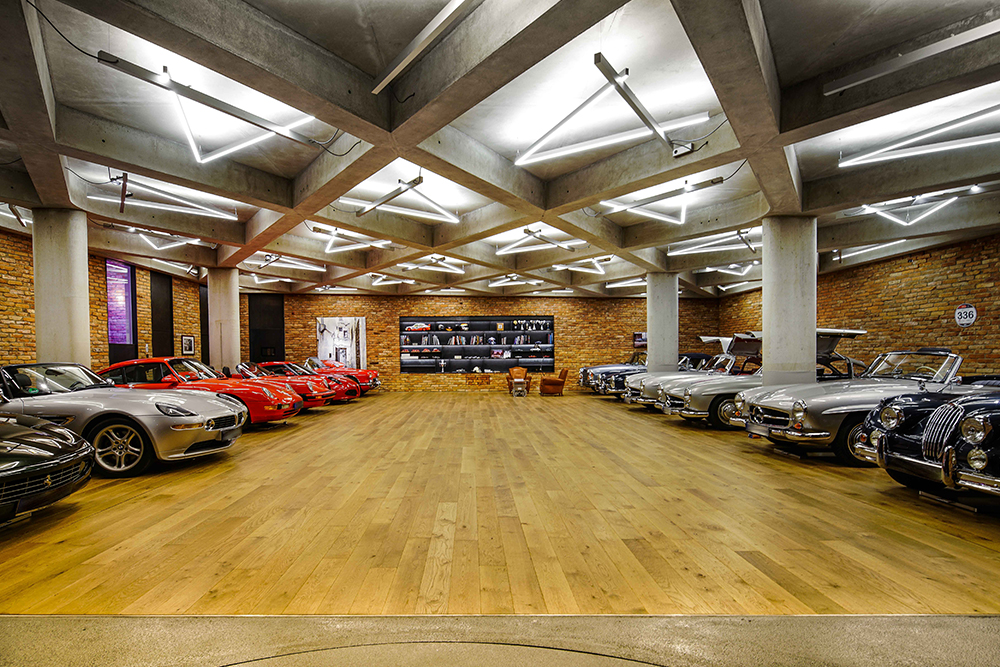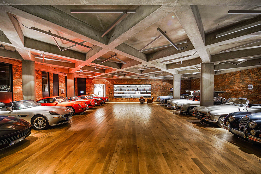 Für die im Untergeschoß des Gebäudes liegende Garage, ein an eine Werkstatt erinnernder Ausstellungsbereich für Oldtimer, wurde für das wabenförmige Deckenraster ein spezielles